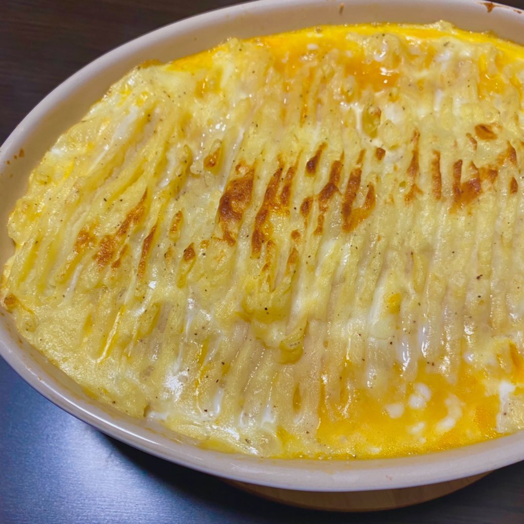 ひき肉にマッシュポテトを乗せて焼いたもので、本来シェパーズは羊肉ですが合挽で作ってます。しかもこれレンジとトースターのみで作れます‼️残ったら食パンに乗せてチーズかけて焼くと最高 pic.twitter.com/6mDEuvROAE